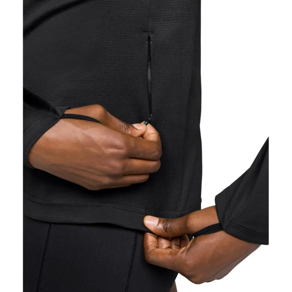 Het On Climate hardloopshirt is ontworpen met een hoge kraag en een ritssluiting, waardoor er minder wind in uw nek waait, maar u ook kunt ventileren wanneer nodig. Met de duimgaten kan er nog meer wind tegengehouden worden en omdat het materiaal snel droog is, voelt u zich gedurende uw training aangenaam fris.