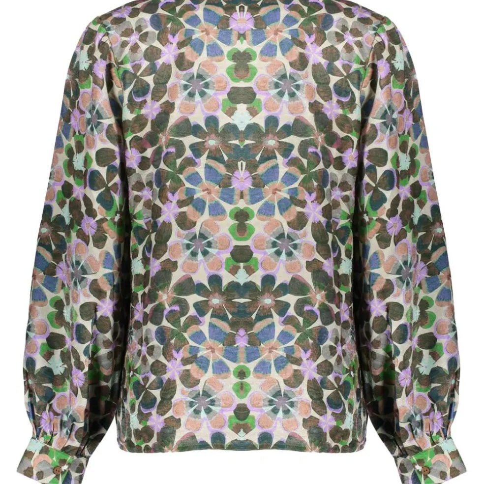 De Geisha blouse heeft een V-hals, ballonmouwen en een sierlijke print, waardoor dit item een unieke en stijlvolle toevoeging is voor uw outfit.