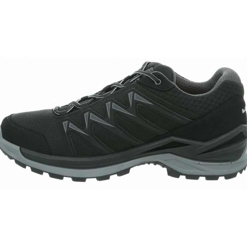 De Lowa Innox Pro GTX Lo wandelschoenen voor heren in de kleur black grey zijn ontwikkeld met een speciale frameconstructie die stabiliteit geeft. Deze Lowa wandelschoenen zijn flexibel en ondersteunen daardoor het natuurlijk afrolgedrag. Het membraam is van GORE-TEX waardoor ze waterdicht, winddicht en ademend van aard zijn. Door het bovenmateriaal van textiel en kunststoffen zijn de wandelschoenen lekker soepel en zitten ze heel comfortabel.