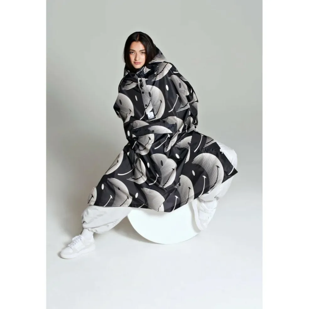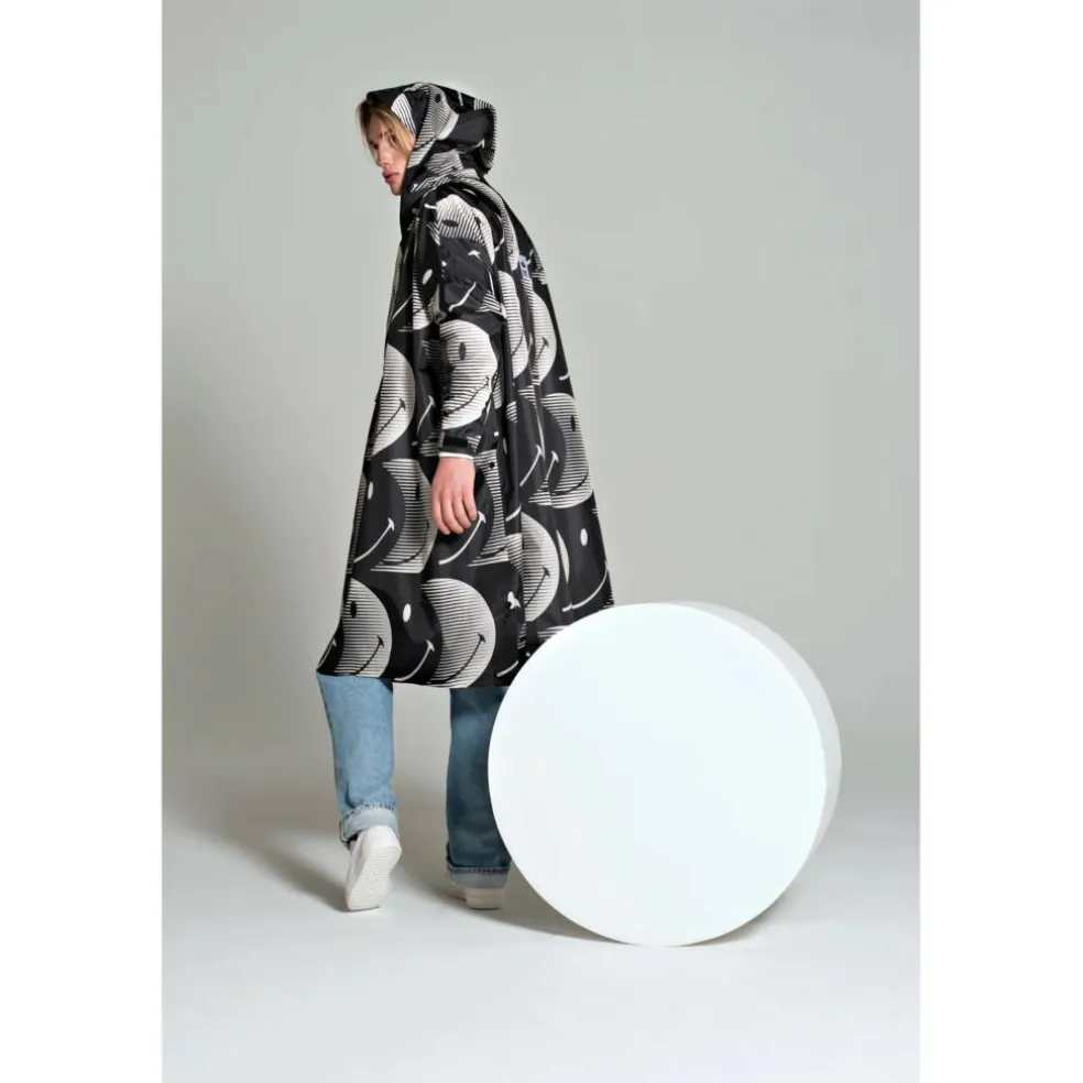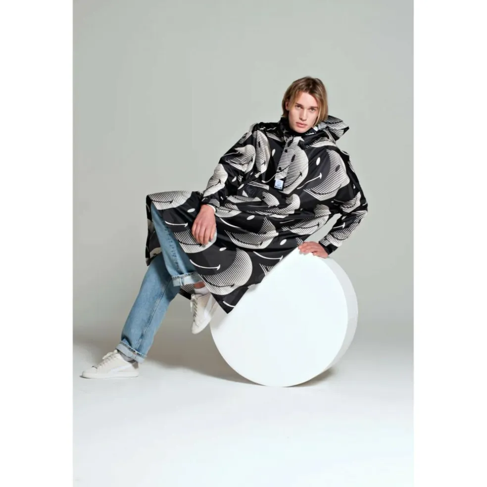 De Half Moon X Smiley regenponcho voor zowel heren als dames biedt bescherming tegen allerlei regenweer. Het design met vrolijke smiley prints geeft de poncho een speelse en trendy look. Voor de productie is gebruikgemaakt van gerecycled materiaal en de afwerking is voorzien van een hoogwaardige klittenbandsluiting. In de mouw zit een QR-code verwerkt die toegang geeft tot een handige weer-app en een exclusieve Spotify-playlist met zorgvuldig gekozen tracks. Dankzij de verstelbare zijkanten aan de onderzijde is de poncho bovendien zeer praktisch en comfortabel tijdens het fietsen.