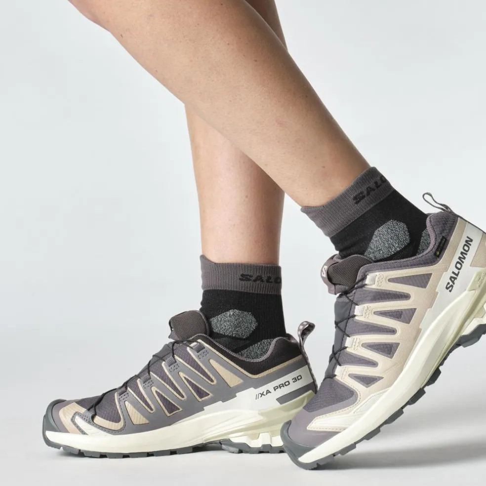 De noppen van de Salomon XA PRO 3D V9 GORE-TEX hardloopschoenen hebben een diepte van 3,5 millimeter en de zolen zijn gemaakt van rubber, waardoor u uitstekende grip ervaart op diverse ondergronden in rotsachtig gebied. De tussenzool geeft energie terug voor krachtigere stappen, maar biedt tegelijkertijd demping voor het zacht opvangen van uw stappen. Dankzij het GORE-TEX membraan blijven uw voeten droog en de teenkap beschermt uw tenen tegen een stootje.