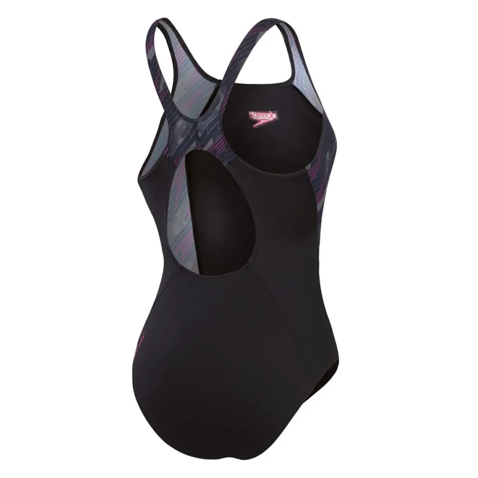 De achterkant van het HyperBoom Muscleback badpak van Speedo is zo gevormd, zodat u optimale bewegingsvrijheid ervaart. Dankzij het deels gerecyclede materiaal kan het badpak goed tegen chloor.